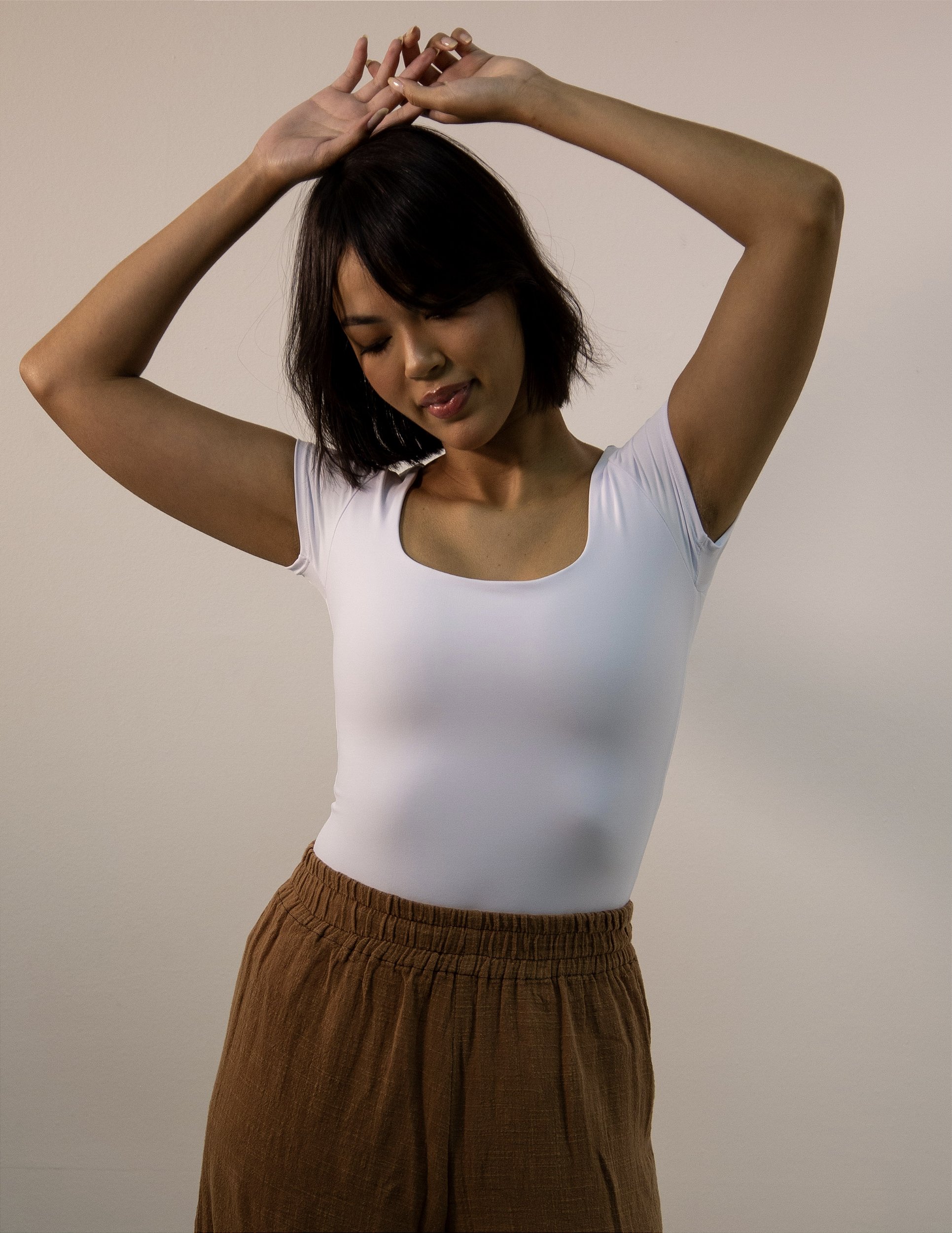 Esse body é a peça perfeita para compor desde os looks casuais até os mais sofisticados. Com decote quadrado que valoriza o colo, o decote canoa que traz elegância e mangas curtas. O tecido macio proporciona conforto e caimento impecável, enquanto o design ajustado ao corpo realça a silhueta de forma sutil e feminina.